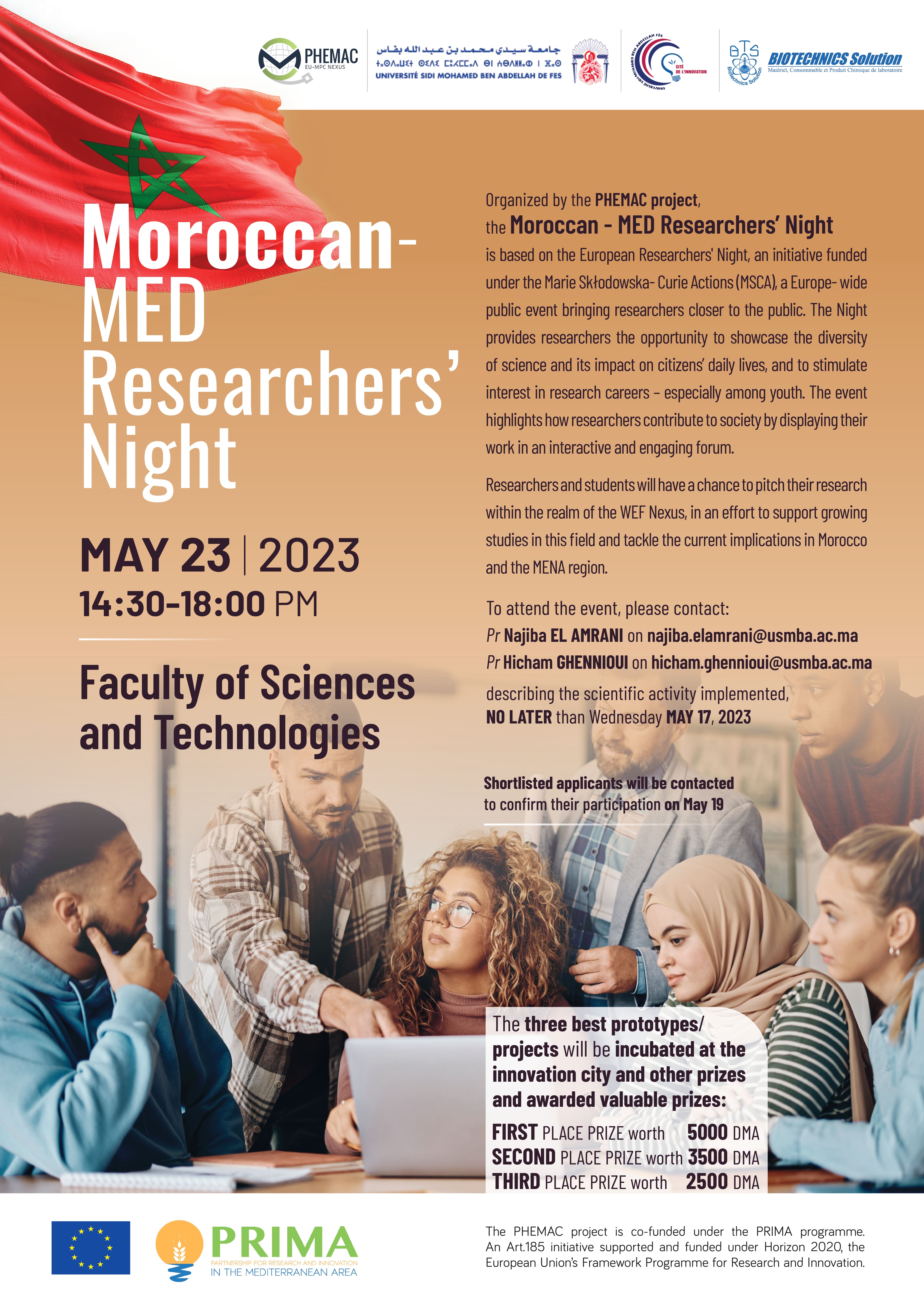 Organized by the PHEMAC project, the Researchers' Night is based on the European Researchers' Night. It offers researchers the opportunity to show the diversity of science and its impact on the daily lives of citizens, and to stimulate interest in research careers, especially among young people. The events highlight the contribution of researchers to our society by presenting their work in an interactive and engaging forum. During this phase, students and researchers will have the opportunity to visit the various workshops and laboratories present at the FST in Fez.